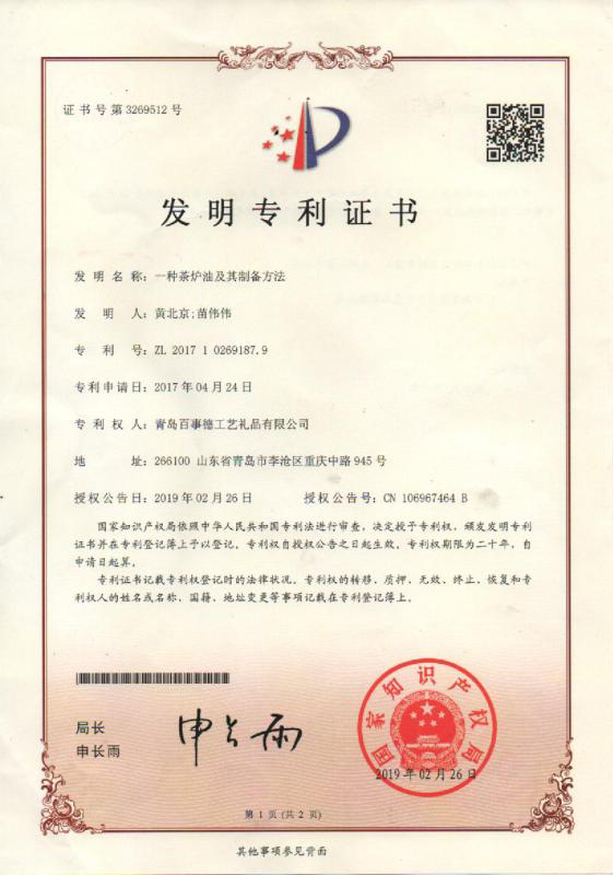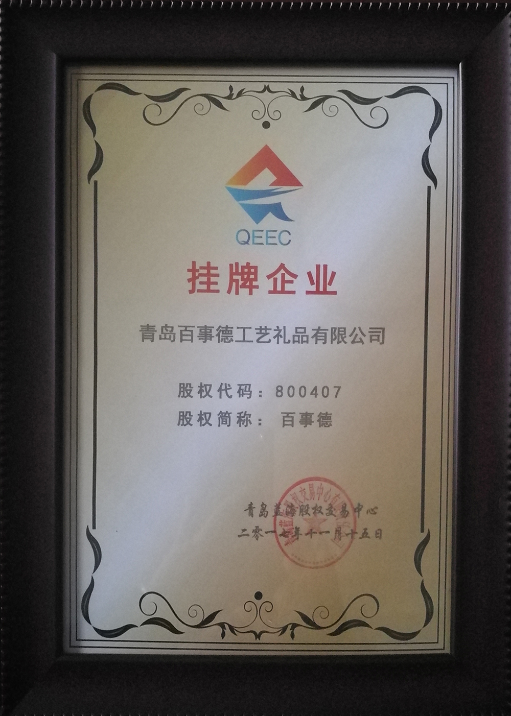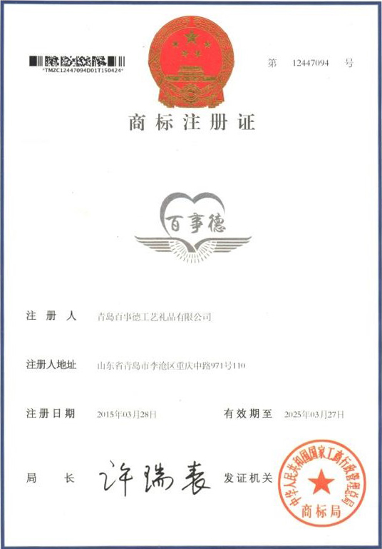 青島百事德工藝禮品有限公司榮獲國(guó)家專(zhuān)利,中國(guó)質(zhì)量服務(wù)4A級(jí)品牌企業(yè),高新技術(shù)企業(yè)等榮譽(yù)稱(chēng)號(hào)